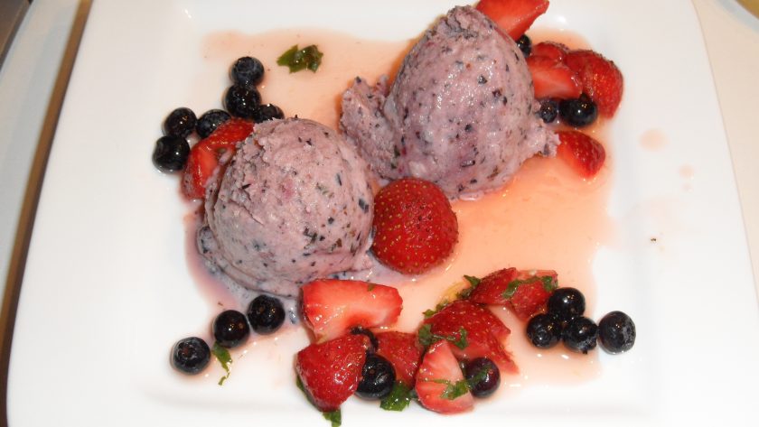 Meng nu de gepureerde vruchten en het ei-melkmengsel en spatel daarna de slagroom er doorheen en zet het minimaal 6 uur in de vriezer. Roer regelmatig met een vork óf gebruik een ijsmachine.
