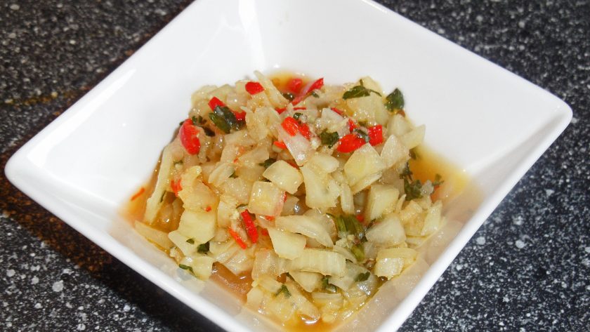 Alle ingrediënten fijnhakken cq. fijnsnijden en samen met het zout in een kom een half uur laten staan.