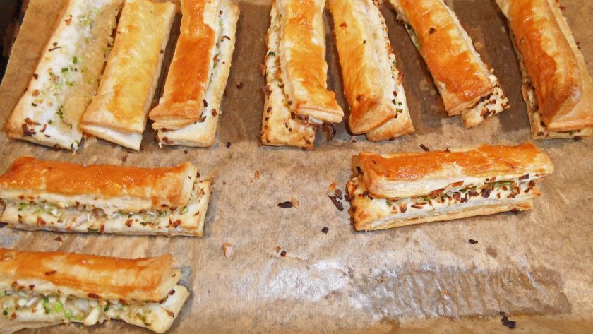 Verdeel het mengsel over 2 bladerdeegvellen, maak de andere 2 aan 1 kant nat en leg deze op de eerste.