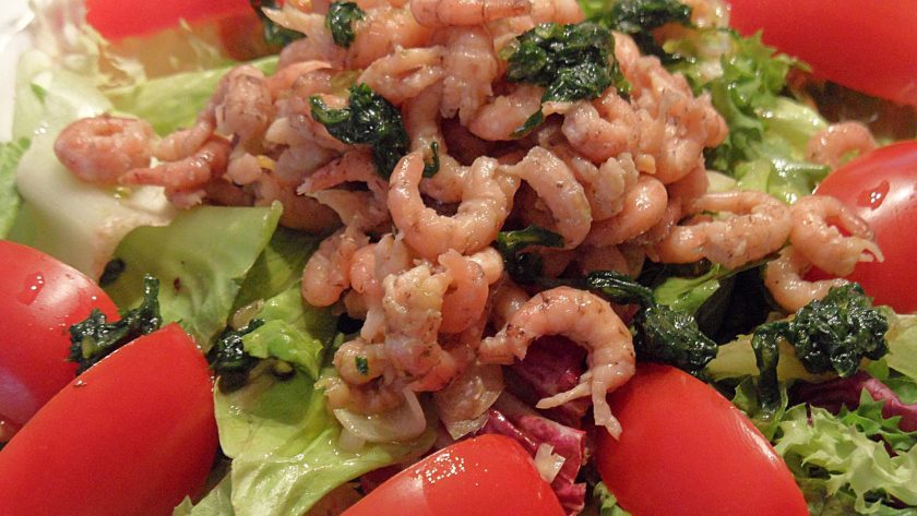 Verdeel dan de garnalen in het midden op de sla en besprenkel dit met de basilicumdressing.