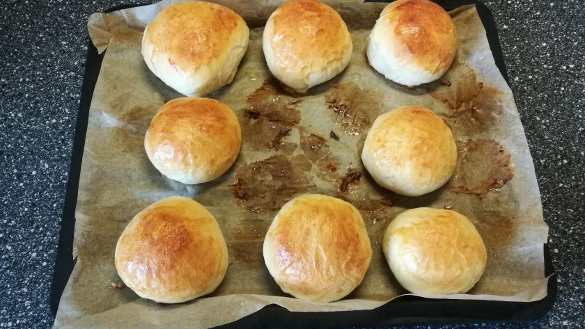 De broodjes op een bakplaat 90 min afgedekt op een warme vochtige plaats laten rijzen. Dan de porties vouwen en opnieuw opbollen. Weer 90 min laten rijzen. Dan de oven voorverwarmen op 230°C, GEEN hete lucht, gewoon boven en onderwarmte.