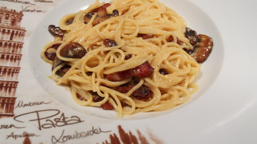 “Bijna”. Waarom? Omdat in een echte Carbonara geen champignons zitten en er meer kleine “oneffenheden” zijn. Maar ik had gewoon zin in champignons en ik had ze liggen.