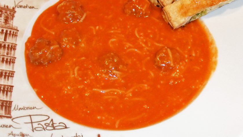In feite is een doodnormale tomatensoep nu klaar. Je kunt er ook voor kiezen om het uit te breiden. Meng dan tijdens de kooktijd van de soep het gehakt, zout en peper, paprikapoeder en knoflookpoeder. Draai hiervan kleine balletjes.