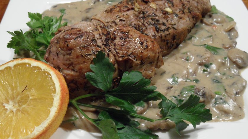 Maak in de tussentijd van de marinade, champignons, room, bouillon, ui, zout en peper een saus en laat deze inkoken. Als deze te dun blijft, bind deze dan met een roux (boter en bloem 1:1) of een bindmiddel naar keuze.