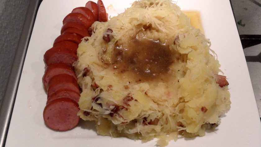 Stamp de piepers, zuurkool en spekkies. Maak van het bakvet een mooie jus.